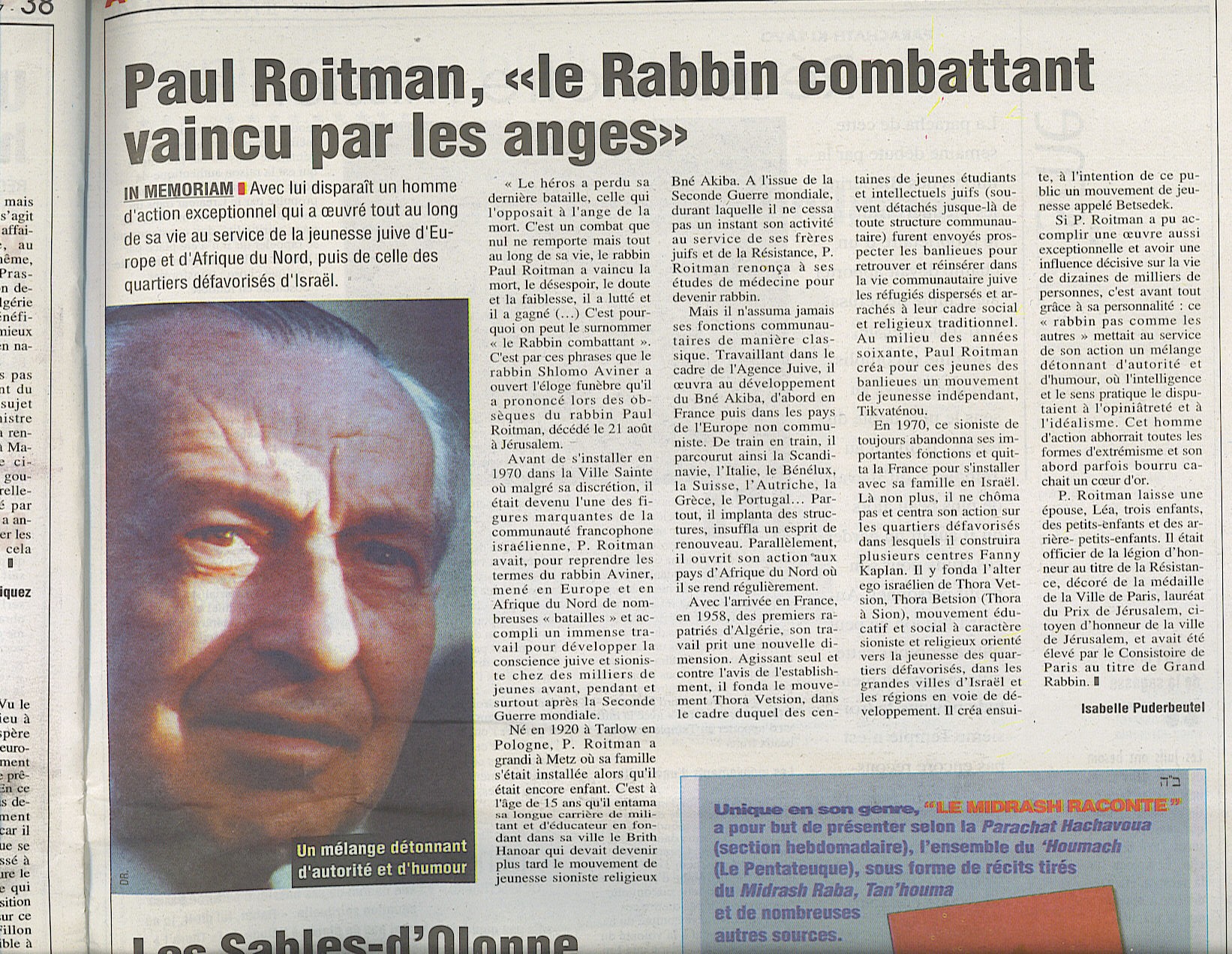 Paul Roitman a été un inventeur, un meneur d’hommes, un réalisateur hors pair. Mais il fut aussi, et peut-être avant tout, une âme généreuse, un leader penché sur chaque détresse, sensible à chaque besoin, et toujours prêt à payer de sa personne. Par-delà les distinctions et les soirées publiques, c’est peut-être dans le secret des cœurs –disciples ou simples inconnus auxquels il a porté secours sans faire de bruit, que le rabbin Roitman a laissé la trace la plus profonde.